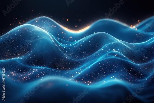 Abstract waves of blue light with shimmering particles, evoking a sense of motion and depth.