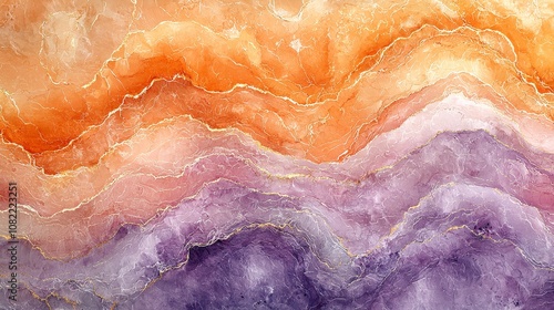 Abstract waves of color in soft orange, purple, and gold tones create a serene visual effect.