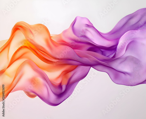 Abstract, wavy fabric in shades of purple, orange, and pink appears to float in the air against a light background
