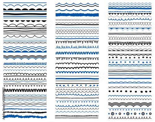 Abstract wavy patterns, hand drawn decorative inky borders. Ornaments, brushes, greeting symbols set. Festive border, hand lettering design elements, pattern collection.