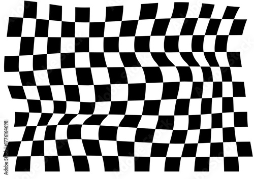 Abstract Wavy Racing Checkered Flag Background Vector. Distorted Black and White Checkerboard Pattern for Graphic Designs, Automotive Banners, and Race Event Covers.