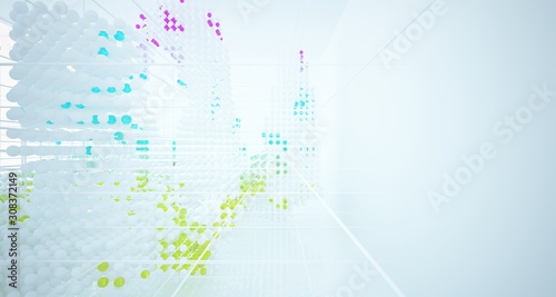 Abstract white and colored gradient glasses interior from array spheres with large window. 3D illustration and rendering.