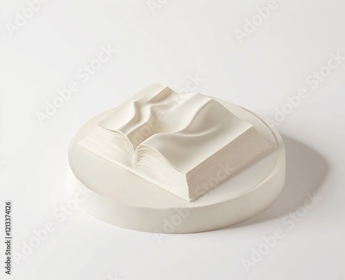 Abstract white ceramic sculpture resembling an open book with flowing pages on a circular base.