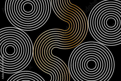 Abstract white lines circles on black background, linear swirls path vector banner template.
