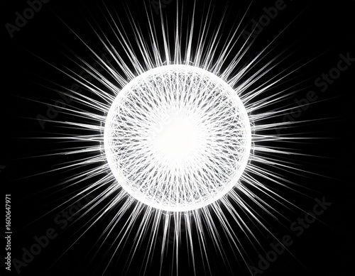 Abstract white sphere radiating lines against a stark black background, creating a bright visual effect.