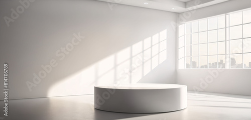 Abstract white studio background with podium and sunlight for cosmetic product presentation