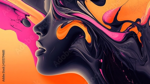 Abstract Woman Profile: Vibrant Colors and Artistic Flow on Orange and Pink Background.
