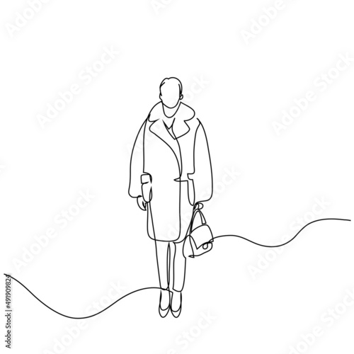 Abstract young woman wearing casual off-season urban clothes and walking streets, hand drawn modern fashion illustration, quick sketch, vector illustration with copyspace for advertising message