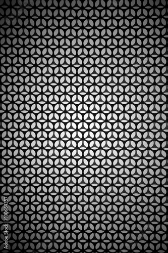 Abstrakte Kreise und Sterne / Die Draufsicht auf eine abstrakt schwarz und weiß gemusterte Metalloberfläche.