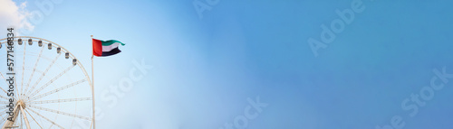 ABU DHABI, UAE 9jan2023. Marina Eye during a bright day, united arab emirates flag alone with wheel and blue sky, space for text on the left.
