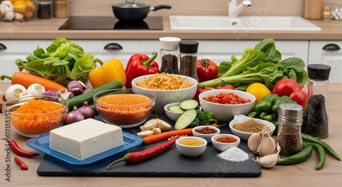Abundant and colorful spread of plant-based ingredients for healthy vegan cooking on a kitchen counter.