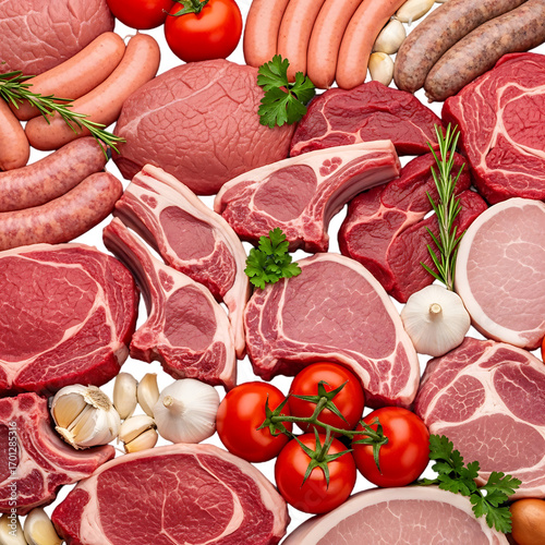 Abundant assortment of fresh raw meats and vegetables displayed together in a lively arrangement