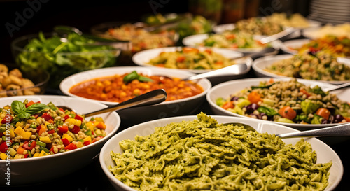 Abundant Buffet Spread Featuring Diverse Salads and Pasta Dishes