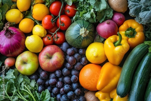 Abundant colorful fruit and vegetable display emphasizing freshness and health