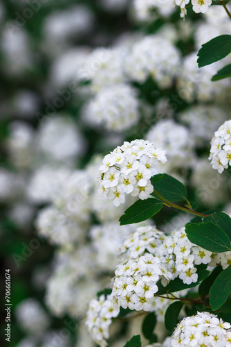 Abundant flowering of white bushes. Spiraea arguta , Brides wreath.