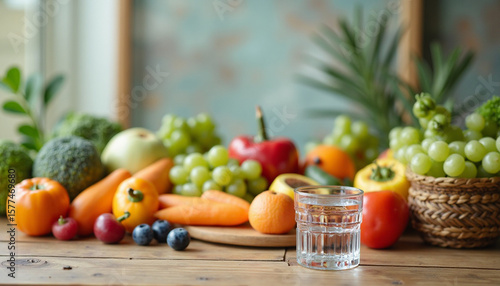 Abundant fruit and vegetable assortment still life with refreshing water presentation