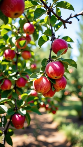 Abundant harvest of ripe red apples hanging from branches in a sunny orchard, september, harvest, organic