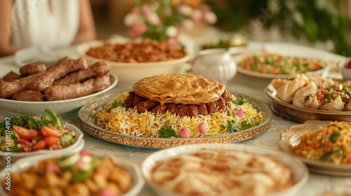Abundant Middle Eastern feast with traditional dishes and colorful presentation
