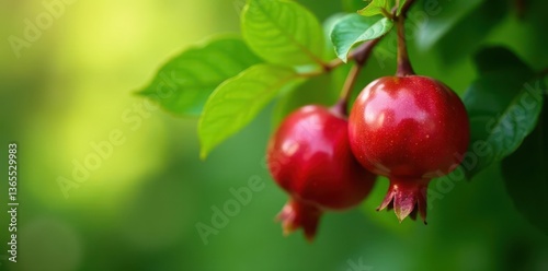 Abundant pomegranates, plump and crimson, hang heavy on a lush green tree , food, organic, vibrant