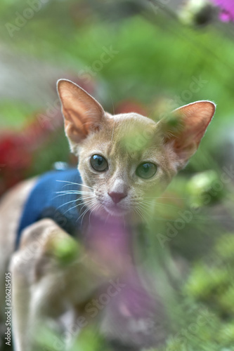 Abyssinian cat of fawn color, close-up portrait, walks along the lawn with flowers
