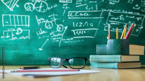 Academic Workspace with Glasses, Books, and Chalkboard Background