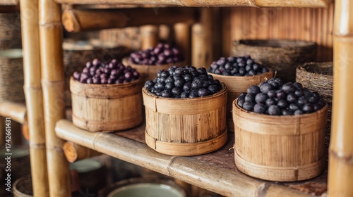 Acai berries in bamboo containers on natural wood shelving. Sustainable eco-friendly aesthetic