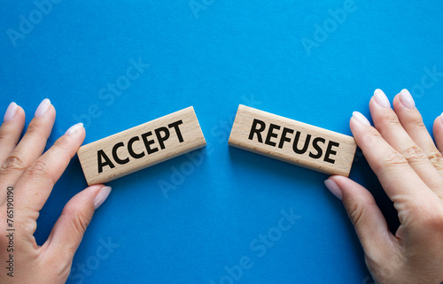 Accept or Reject symbol. Concept word Accept or Reject on wooden blocks. Businessman hand. Beautiful blue background. Business and Accept or Reject concept. Copy space