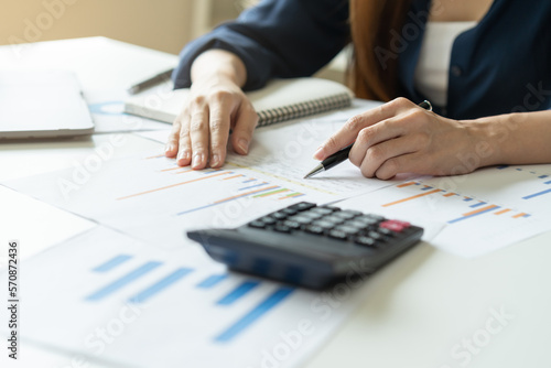 Account finance, analysis asian business woman hand use pen for calculate budget, cost and income of company from on charts, reports paperwork, plan spend money expenses, working on desk at home.