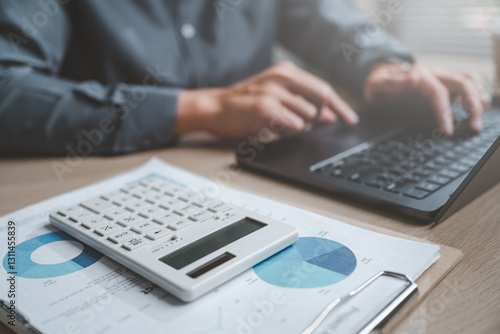 Accountant used a calculator financial analysis managing payroll tax accounting budget accounts.