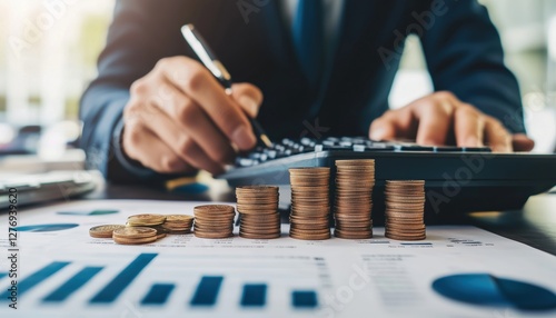 Accountant Utilizing Calculator With Coins And Financial Report In Business, Finance, And Investment, Including Currency Exchange And Economic Graph Growth.