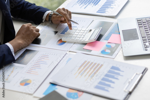 Accountant working financial investment on calculator, calculate, analyze business and marketing growth on financial document data graph, Accounting, Economic, budget planning.