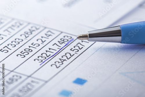 Accounting document with pen, money, coins and checking financial chart. Concept of banking, financial report and financial audit.