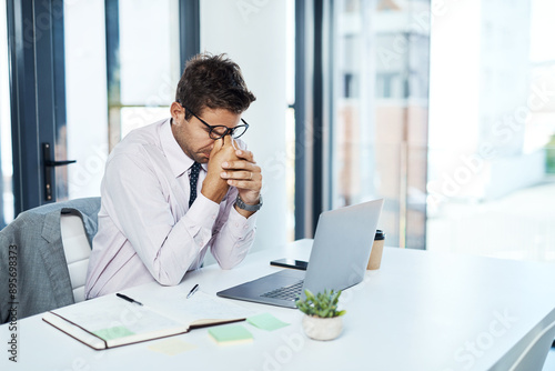 Accounting, laptop and stress with business man at desk in office for review of investment portfolio. Audit, budget or debt and employee with burnout or headache for bankruptcy or economic depression