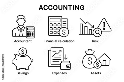 Accounting line icon set with accountant, financial calculation, risk, savings, expenses, and assets. Thin line vector symbols for finance, business, and bookkeeping.