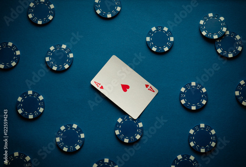 Ace of hearts among blue chips on a table in a club. Gambling and a sign of a big win in poker