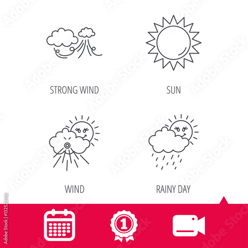 Achievement and video cam signs. Weather, strong wind and rainy day icons. Sun linear sign. Calendar icon. Vector