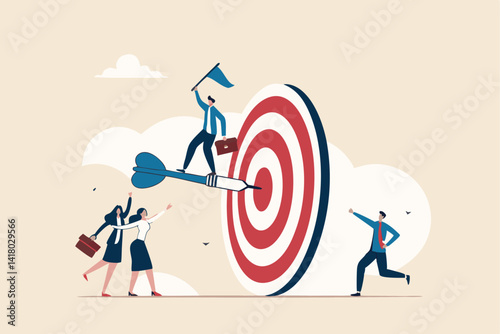 Achievement, reaching goal or meet target, winning business challenge, success or teamwork helping to achieve target concept, success businessman holding winning flag on dart hitting bullseye target.