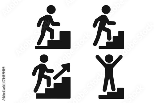 Achievement success motivation icons set. Stick figure person climbing stairs, personal growth, career development, progress symbol, ambition, goal accomplished, flat vector illustration