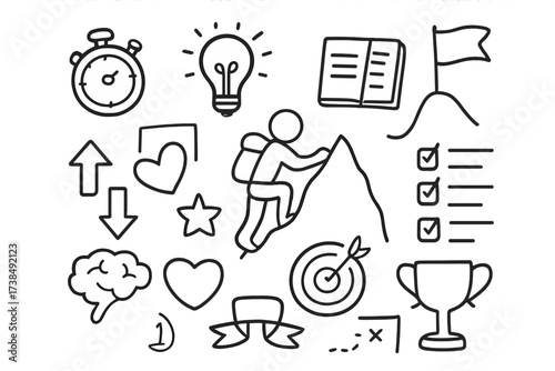 Achievement Symbols Doodle. Hand-drawn doodle illustration personal challenge person climbing mountain, stopwatch, light bulb, journal, checklist, medal, flag,