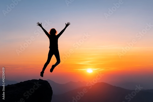 Achieving Success Sunset Jump - Silhouette of a woman joyfully leaping at sunset, symbolizing achievement, freedom, hope, overcoming challenges, and new beginnings