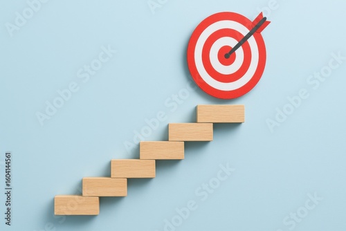 Achieving Success with Targeted Goals A Wooden Block Staircase to a Bullseye in a Light Blue Setting