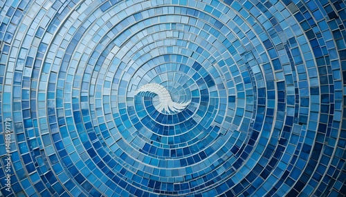 Acircular mosaic with concentric ocean wave patterns, made from polished tiles in gradients of blue, minimalist gallery background.