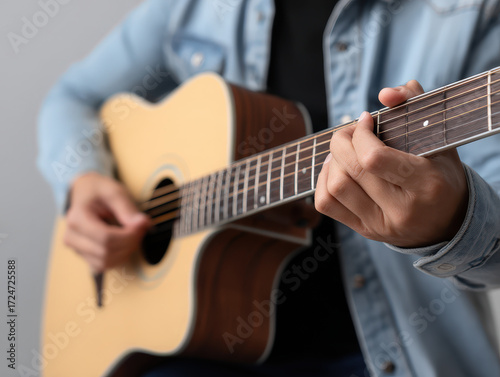 Acoustic guitar player strumming wooden instrument strings with fingers closeup, cozy music hobby indoors with casual denim jacket style