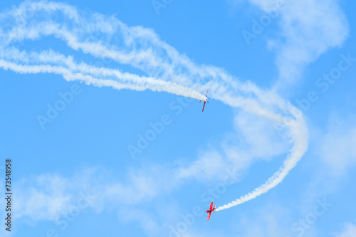 Acrobatic planes flying on blue sky at airshow in Krakow, Poland