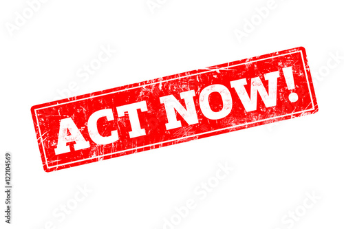 ACT NOW word written on red rubber stamp with grunge edges.