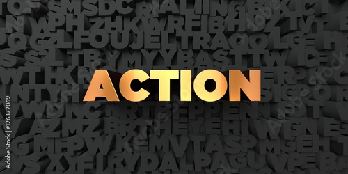 Action - Gold text on black background - 3D rendered royalty free stock picture. This image can be used for an online website banner ad or a print postcard.