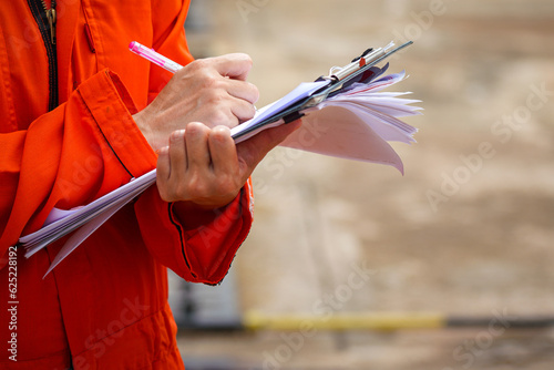 Action of a safety officer in full PPE coverall is writing note on paper document during perform safety audit at construction worksite. Industrial expert working scene. Selective focus.