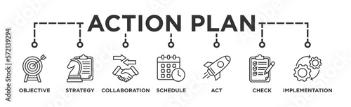 Action plan banner web icon vector illustration concept with icon of objective, strategy, collaboration, schedule, act, launch, check, and implementation