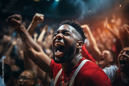Action shot of a basketball player shooting during a crucial game, crowd cheering in a stadium, high energy