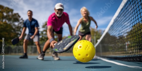 Active adults enjoying a game of pickleball, showcasing teamwork and excitement on the court